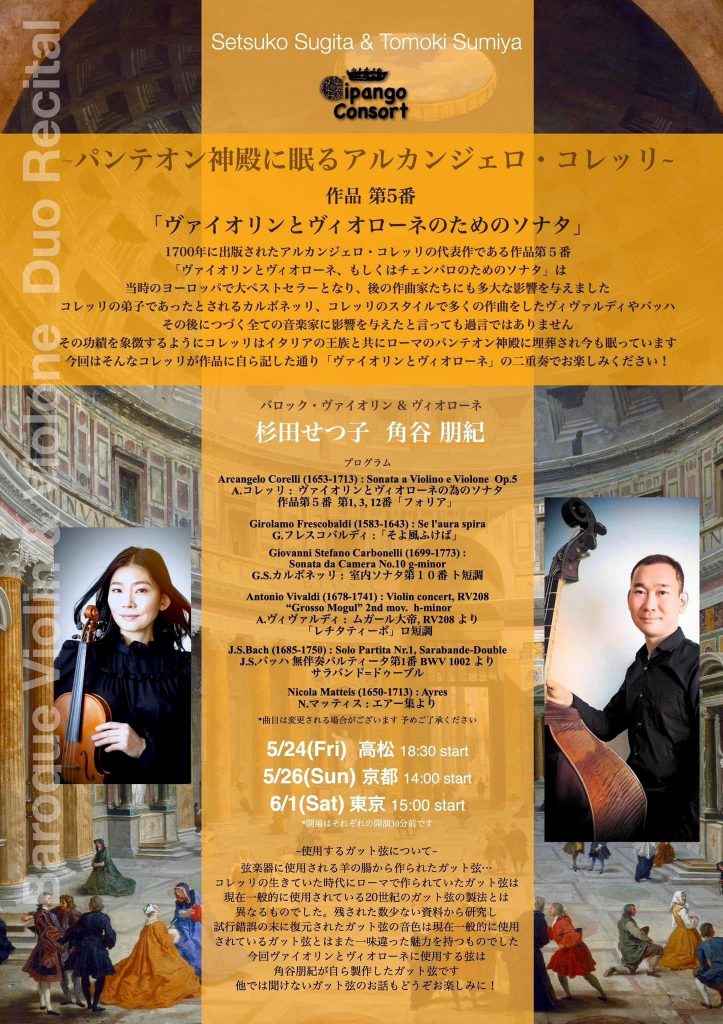 と題して、1700年に出版されたアルカンジェロ・コレッリの代表作である作品第5番「ヴァイオリンとヴィオローネ、もしくはチェンバロのためのソナタ」から”フォリア”を含む1,3,12番を、そしてコレッリの弟子であったとされるカルボネッリ、コレッリのスタイルで多くの作曲をしたヴィヴァルディ、バッハ…先日の歌舞伎/中村福助・児太郎丈の新作御舞台で演奏し、大変多くの嬉しい反響を頂戴した無伴奏パルティータやマッティスの小品と共に、お話も交えお届けいたします,。・:*:・☆゚