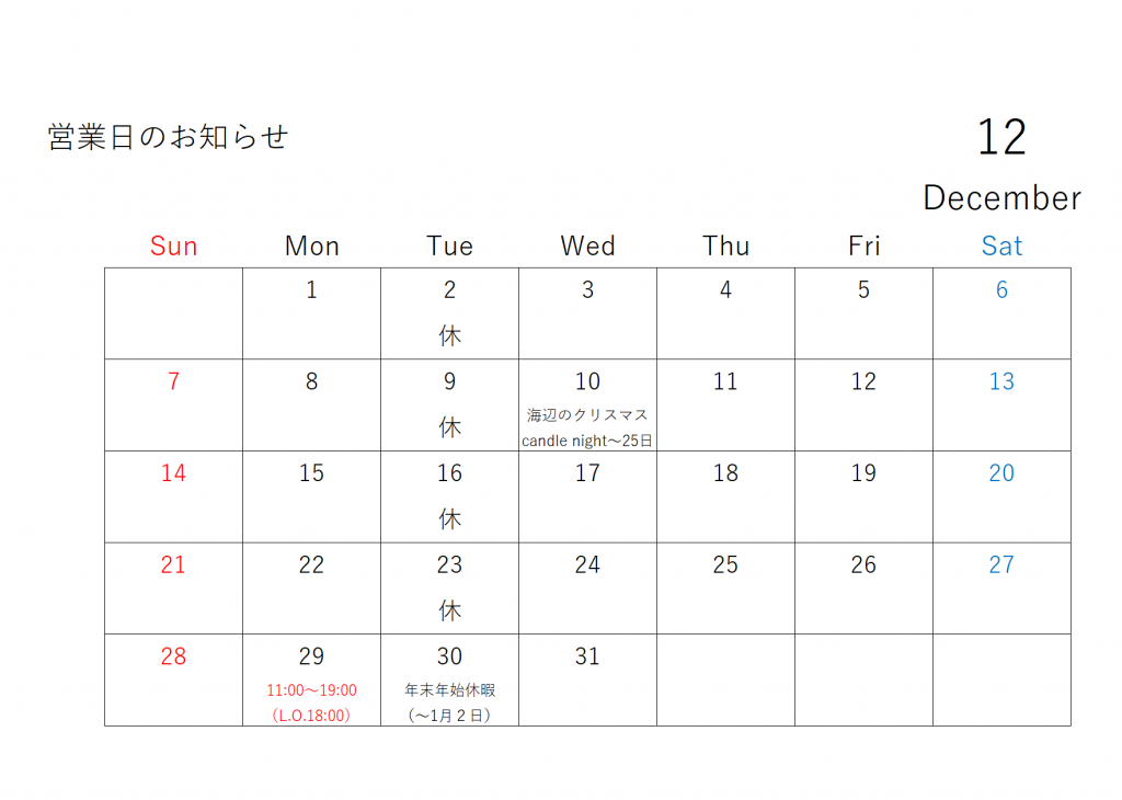 10日(水)から25日(木)まで「海辺のクリスマス candle night 」を開催いたします。