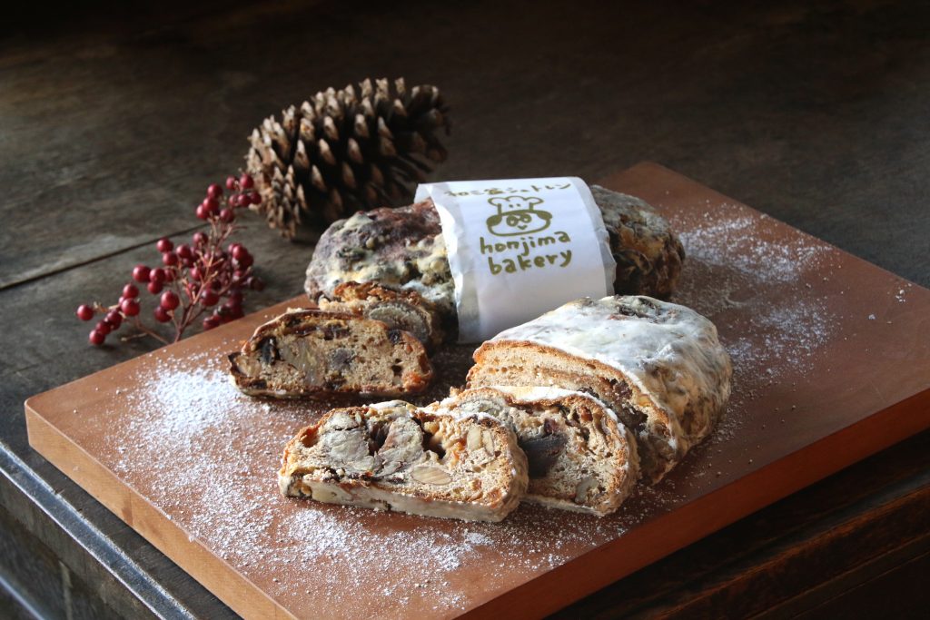 クリスマスシーズンが楽しくなるシュトレン。honjima bakery さんから、自家製和栗の渋皮煮やナッツ、ラム酒漬けフルーツがぎっしり入った人気のシュトレンが届きました。